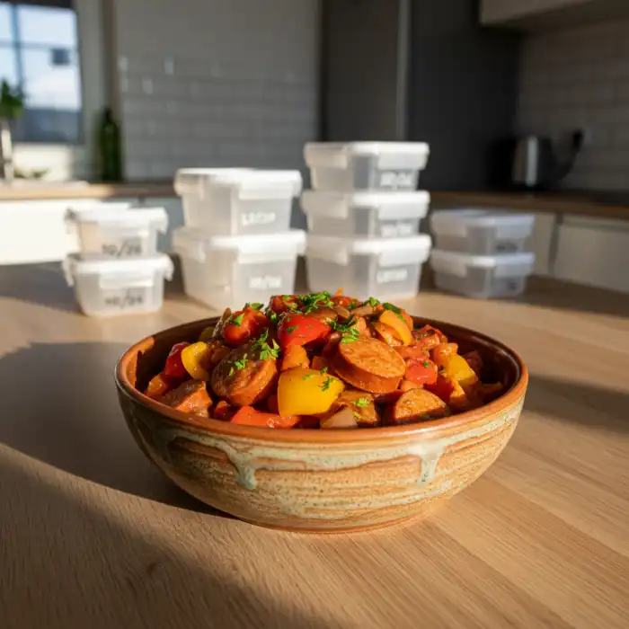 - Kiełbasa – dodatek mięsny, który w leczo pozostaje smaczny przez długi czas.